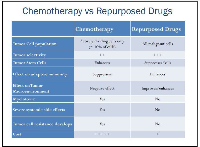 In general, drug repurposing provides the advantages of faster development, lower costs, and increased availability. More specifically, in regards to cancer treatments, repurposed drugs have a number of distinct advantages over chemotherapy.